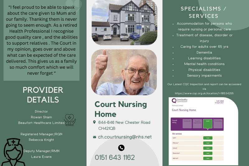 Court Nursing Home is a nursing home in the area of Birkenhead - it has a 'Good' rating from the CQC. Care can be provided for those with dementia and mental health needs.
