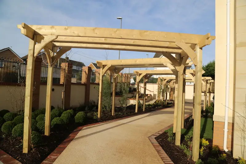 The garden is a grand arbour walk running along one side of the home and continuing around the back wrapping sensory gardens and planting garden for residents. An interactive patio garden with a several pergolas and planting platforms.