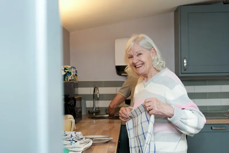 People’s own bedrooms provide private space personal to them, enhanced with their own belongings and creating a feeling of familiarity and safety that is truly their own. Easy access from the lounges to two enclosed gardens provides a sense of freedom and independence for people as they freely take a walk outside; sit and chat on a bench, help hang the washing out and sweep the paths.